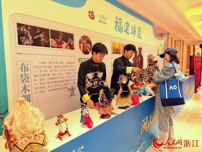 推介会现场,南音《百鸟归巢》、情景推介《坊巷芳华》、歌曲《一路山海一路歌》等特色节目轮番上演,生动展现福建生态清新与人文多彩的独特魅力。会场非遗展区更是人头攒动,洋溢着浓郁的闽地文化气息。“你们见过能把‘亭台楼阁’戴在头上的软木画吗?”“灯光一照,德化白瓷可见指影,薄如蝉翼。”“手指微动,木偶便活灵活现——这就是漳州布袋木偶戏的细腻之处。”德化白瓷、漳州布袋木偶戏、软木画、茶百戏、脱胎漆器、福州三条簪、泉州簪花围、惠安女、畲族凤冠等国家级、省级非遗项目集中展示,吸引众多嘉宾驻足体验。