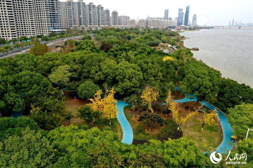 红谷滩渔舟湾内金黄的银杏树与常绿树木相映成景。人民网记者 时雨摄