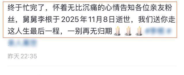 关于其去世的原因,外甥媳妇并没有公开,但她表示后续会有这方面的报道,不过据小道消息称,李根的去世与疾病亦或者意外并没有多大关系,而且提到了“喝药”。