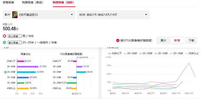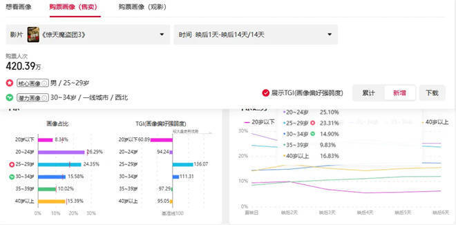 猫眼专业版数据显示,该片购票画像中核心观众为25-29岁的男性群体,且多集中于一、二线城市。但有趣的是,在观影人群的年龄分布上,20-24岁观众的潜力反而大于30-34岁群体,两者之间相差近十岁。
