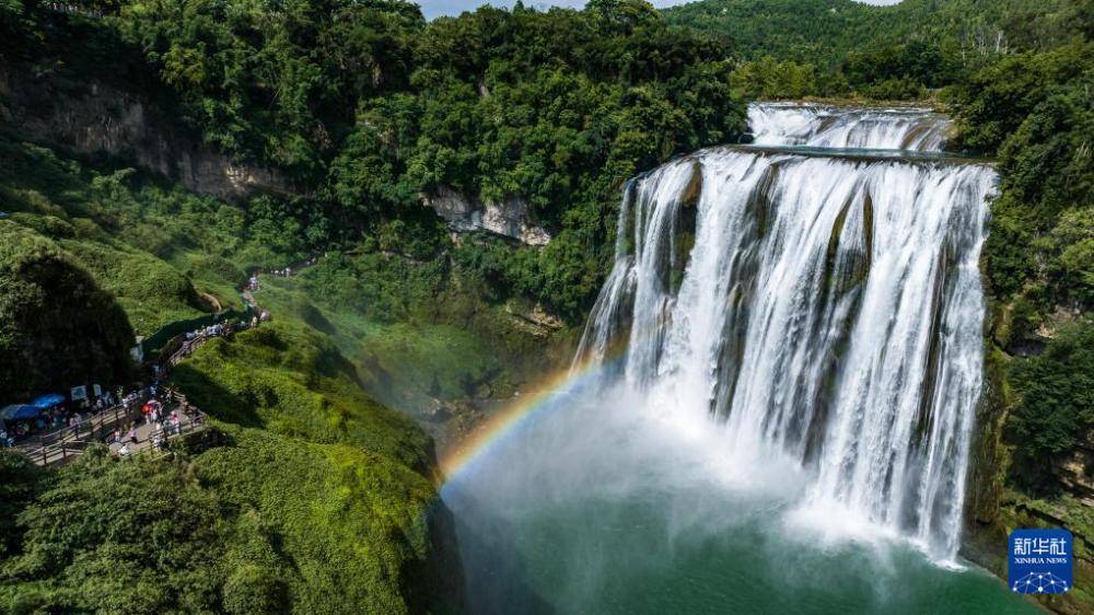 7月16日,游客在贵州省安顺市黄果树瀑布景区游览(无人机照片)。图/新华社