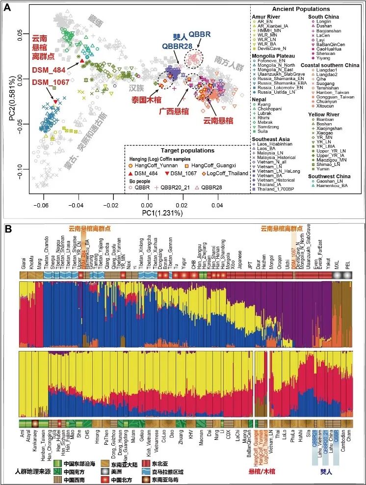 悬棺葬人群与僰人的遗传结构(A.主成分分析;B.遗传祖源成分分析)。受访者供图